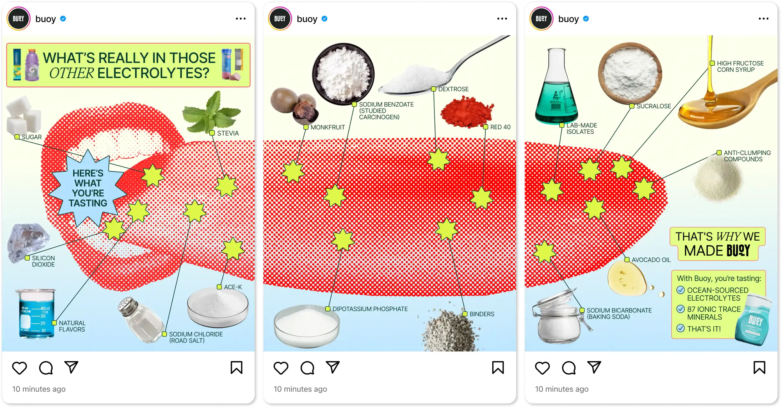Rather than hard-selling, our social content for Buoy strives to educate. Some of their highest performing posts included deep-dives into commonly mistaken subjects such as natural flavors and electrolyte ingredients. Studio broke down information dense topics into easy chunks, while never sacrificing visual appeal.